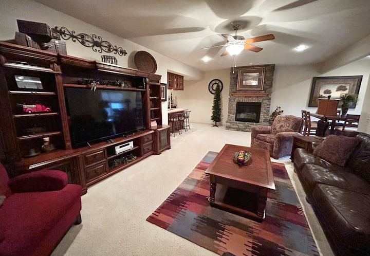 This beautiful home (formerly known as Stay and Play Getaway) has plenty of room to sleep 16 guests and enjoy cooking big meals in this spacious kitchen. The kitchen offers all the amenities you need for those delicious meals. There’s a gaming room for the kids to enjoy what kids love to do. Very nice large enclosed deck upstairs that backs up to the woods. Upstairs you will also find two bedrooms, both having King beds. One bedroom offers an en-suite bathroom with a jacuzzi tub, which is great for relaxing after a long day at Silver Dollar City. Downstairs you can enjoy a bar area, fireplace and another whole living area for relaxing in. There’s also another patio downstairs for enjoying the beautiful nature of Stonebridge. There are 2 bedrooms downstairs and both of them have king beds and one bonus room with 2 twin bunks beds. There are so many amenities to enjoy in this home.