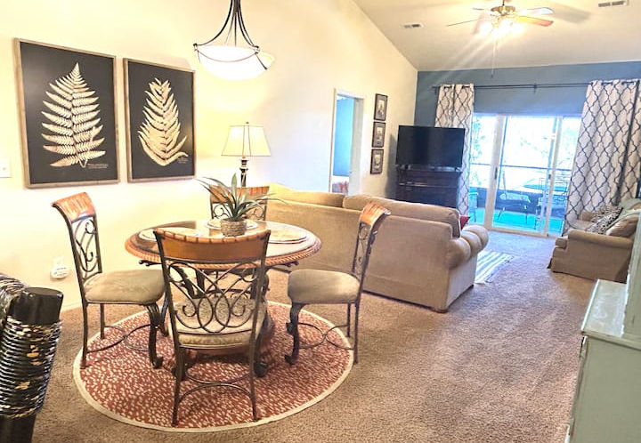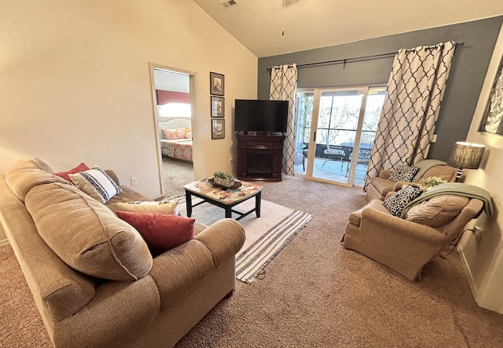 Map out your Branson family escape to this tastefully furnished 3-bedroom, 3-bath home located just under 4 miles from Silver Dollar City. This inviting condo has TVs in every room, an electric fireplace, screened -in porch, and access the resort amenities including pools and tennis courts. Whether you're in town to explore the Branson Strip, boat on Table Rock Lake, or golf at the Ledgestone Country Club, this property is the perfect. Bring the family to this great place with lots of room.