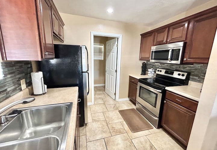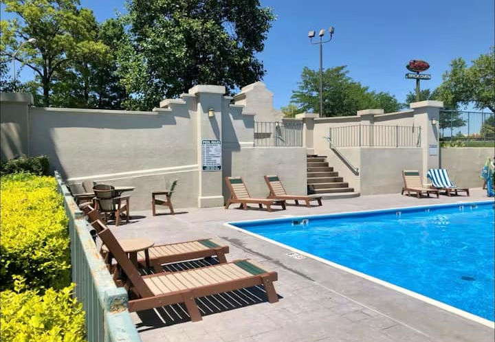 Your family will be close to everything when you stay at this beautifully decorated and centrally located condo. This is a large (1200 square feet) two bedroom, two bath condo located at The Greens. This excellent location is one block off the strip and walking distance to putt putt golf, the aquarium, Grand Village and the delicious Italian restaurant called Florentinas. This location is also great for the baseball tournaments at Ball Park of America. It’s approximately 2 miles away.
