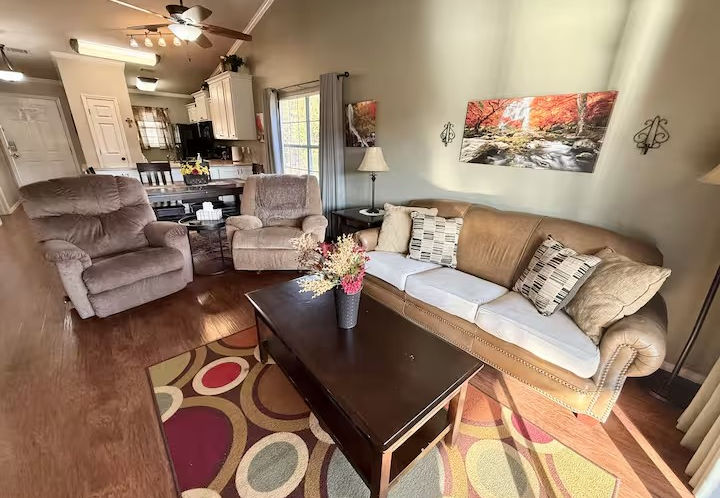 The open-concept living area is designed for gathering and unwinding. Enjoy comfortable seating, natural light, and a warm, welcoming atmosphere that makes you feel right at home. It’s the perfect place to relax after a day exploring Branson.