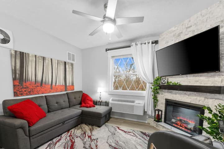 Enjoy this unique and tranquil getaway at this beautiful 1 BR/1BA condo just 2 miles from Silver Dollar City. This cozy condo has gorgeous modern details throughout, along with a beautiful electric fireplace for those nights you want a little ambiance . This fully stocked kitchen is great for cooking and it even has a grill to make some delicious steaks. You are 10 min. from the Branson strip that is full of fun, shows and attractions. Indian Point Marina is just across the street.