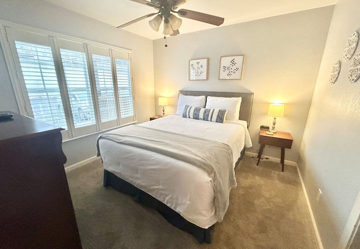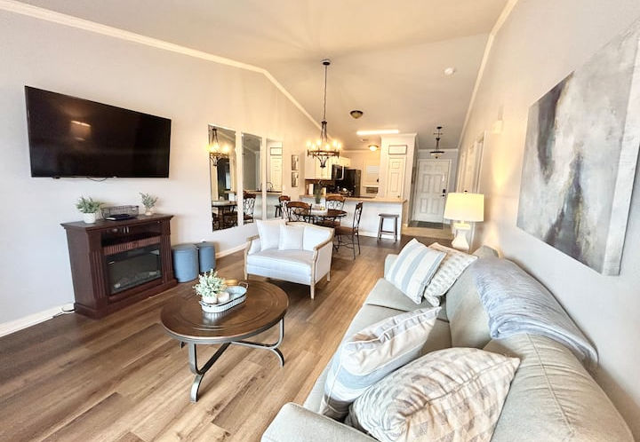 The first thing you will notice when arriving at this stunning condo is, NO STAIRS!!! Once you enter you will see it’s beautifully decorated and then the gorgeous view off the deck. It’s peaceful and fun to watch the ducks play. It’s a great spot for relaxing, morning coffee or an evening night cap! The bedroom is cozy and offers a comfy queen bed. There is plenty of room in the fully stocked kitchen for cooking and has a full size stackable washer/dryer. You will love this cozy home away from home.