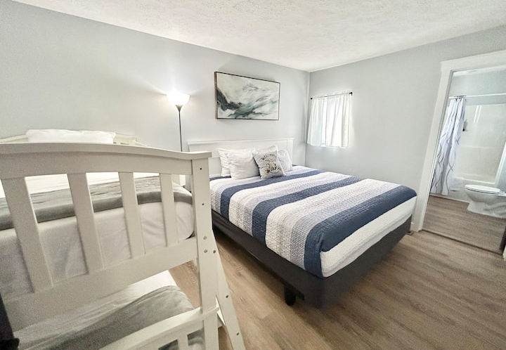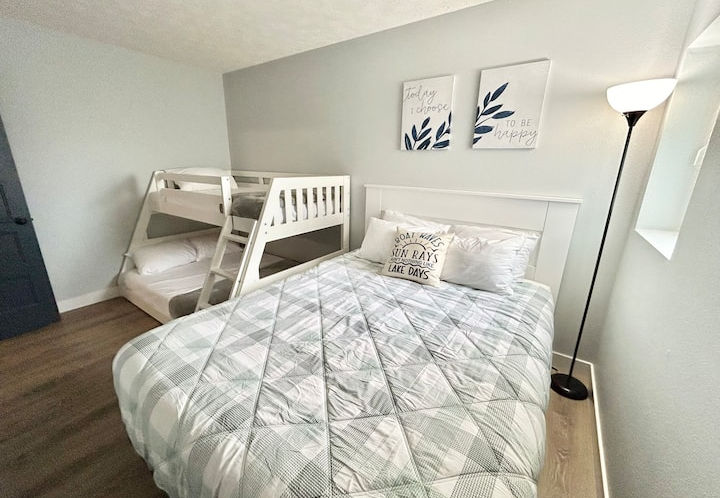 1st bedroom: Queen with bunk beds/ full on bottom twin on top.